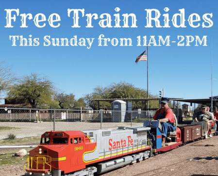 Train Rides the Sunday at Maricopa Live Steamers! We are located at 22822 N 43rd AVE in Glendale right across from the water park. Rides are free, however we accept donations to keep the railroad running. Children must be able to walk to and board the train without assistance. All Aboard! 🚂 (link)